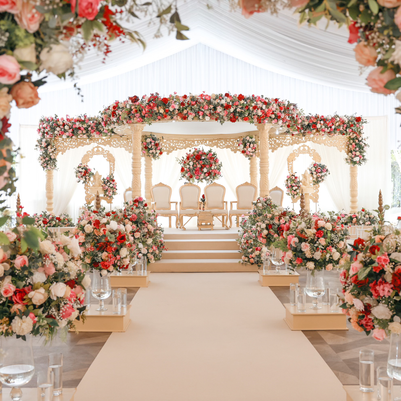 WE OFFER A RANGE OF CONTEMPORARY AND TRADITIONAL MANDAPS, FROM CARVED DESIGNS TO ELEGANT FLORAL WRAPS. OUR TEAM WORKS CLOSELY WITH YOU TO CREATE A BESPOKE, STUNNING MANDAP THAT PERFECTLY REFLECTS YOUR VISION.