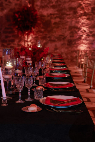 The final celebration took place in the castle courtyard, setting the stage for a sophisticated black-tie reception. The décor featured bold red accents and lots of candles, creating a dramatic and elegant atmosphere.